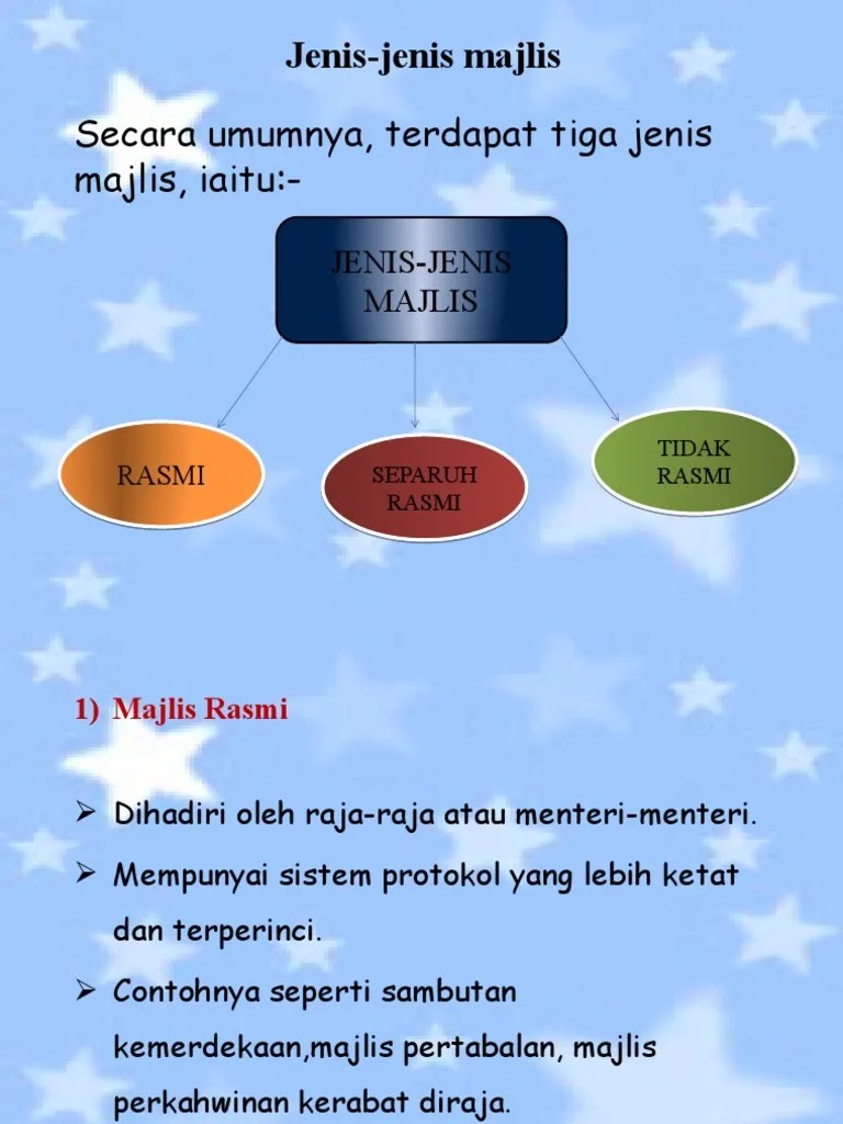 Seperti contoh, jamuan tahunan majlis daerah serta jamuan tahunanjabatan pendidikan negeri. Majlis tidak rasmi dan tidak formal. Contoh senarai jawapan jawapan kehadiran tidak bil nama seorang berdua hadir 1. 02/11/21 jabi/iabu 1 5 jenis majlis. Protokol majlis rasmi di sekolah. Majlis penuh istiadat majlis rasmi dan formal majlis rasmi tetapi tidak formal majlis . Contoh teks pengacaraan majlis formal.
